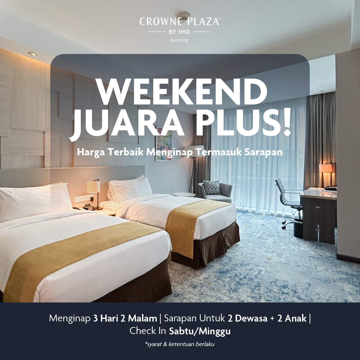 – Untuk reservasi promo Weekend Juara di tipe kamar Standard Queen Bed, silakan melakukan pemesanan langsung melalui telepon (022) 3000 2500 atau WhatsApp RSVN Crowne Plaza Bandung.(+62 812 2370 7010)
